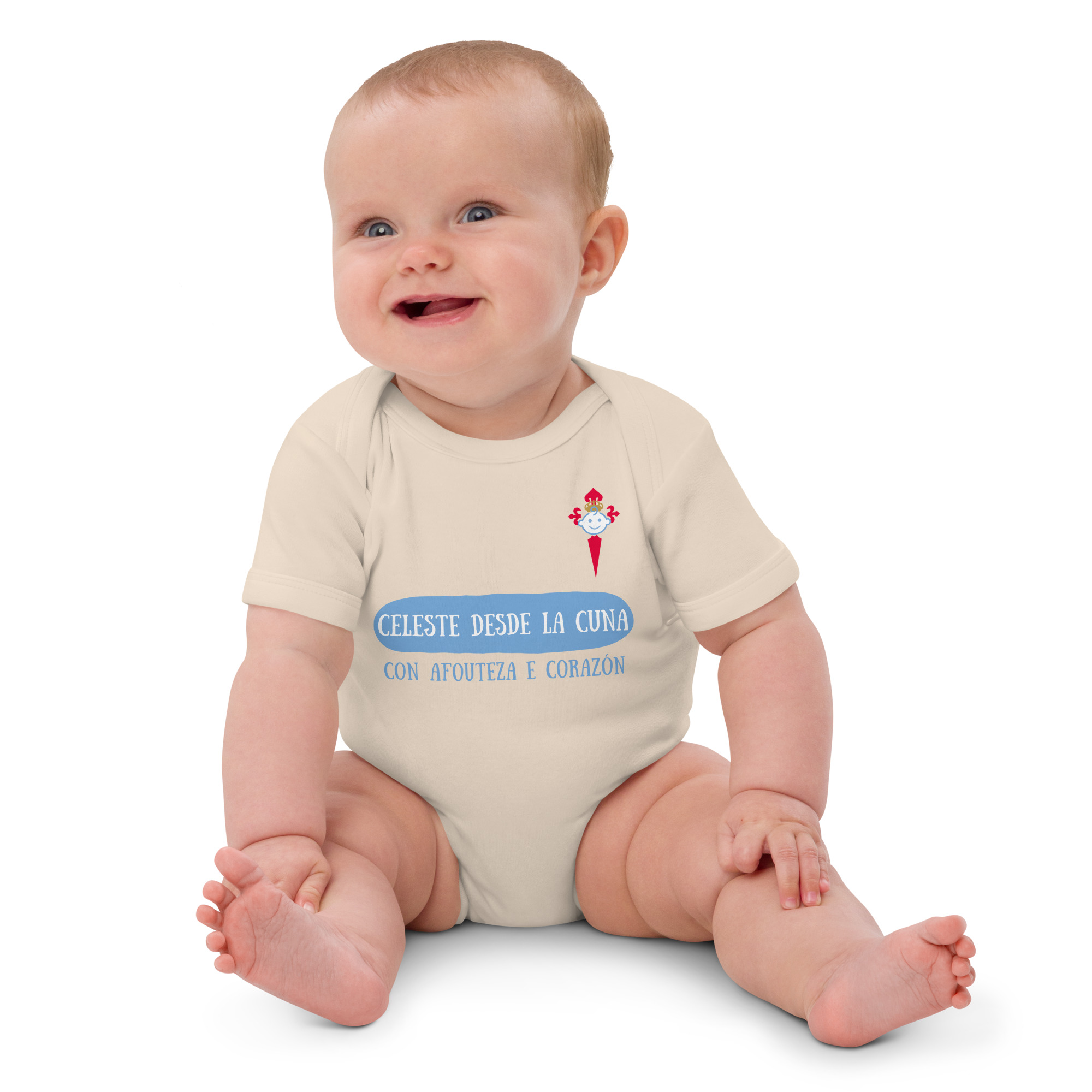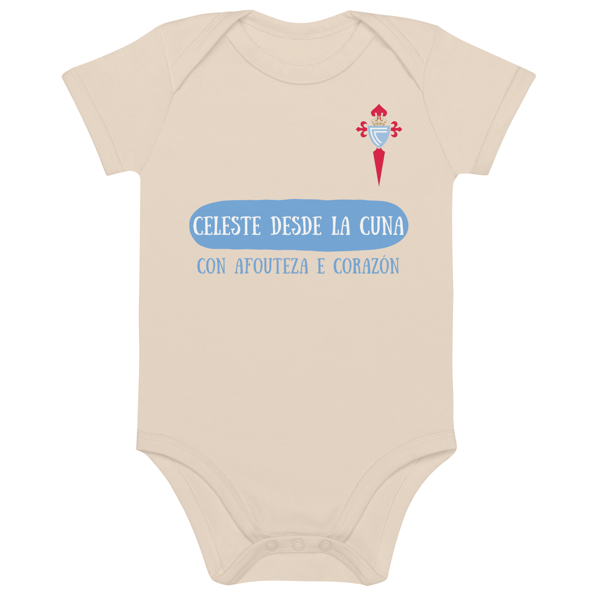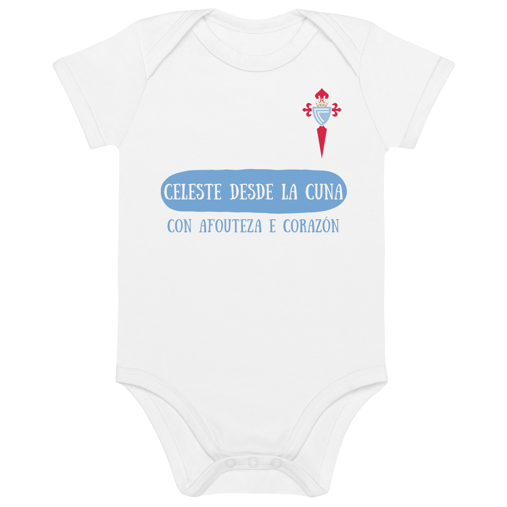 Si llevas al Celta de Vigo en el corazón y quieres transmitir esa pasión a tu bebé desde el primer día, este body es justo lo que buscabas. Con la frase “Celeste desde la cuna con afouteza e corazón”, tu peque lucirá orgulloso los colores celestes y demostrará desde el primer minuto su amor por el equipo. ¡El outfit ideal para vivir juntos cada partido!